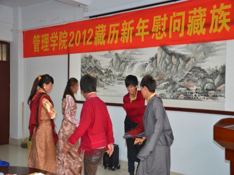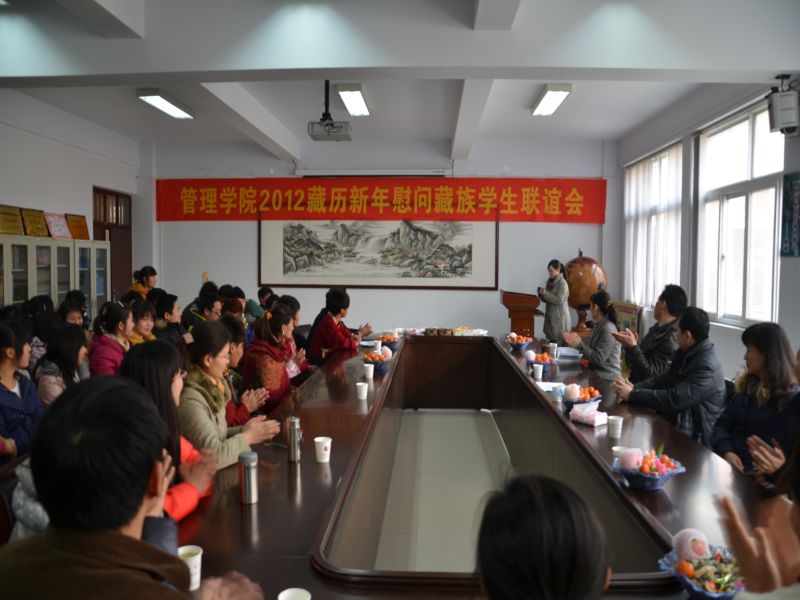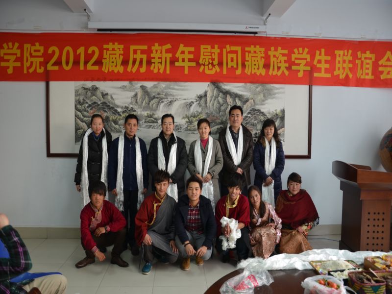 2012年2月22日是藏历水龙新年初一,为了能使在我院2011级法律事务专业读书的6个藏族学生度过一个安乐祥和的新年,beat365官网在3108会议室为他们举办了一场藏历新年联谊会。校学生处处长李本、校团委书记孔颖、校党委宣传部副部长王伟龙、beat365官网院长郭琰、副院长王斌、党总支副书记孙江虹以及部分教师代表,和2011级法律事务班的全体同学一起,欢聚一堂,庆贺新年。