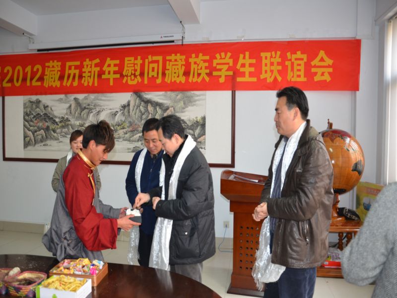 下午1:30分联谊会开始,校学生处李本处长首先对藏族学生表达了节日的问候,对豫藏两地近年来在各个层面上的交流进行了回顾和总结,对6名藏族学生的学习、生活等方心进行了关心、慰问。beat365官网郭琰院长对6名藏族学生提出了殷切地希望,希望他们能够更好地学习科学文化知识,将来可以更好地建设西藏。藏族学生代表旦增罗布同学则汇报了半年来在中州大学的学习和生活情况,对各级领导、老师、同学们对藏族学生的关心、关怀表示感谢。与会领导给藏族学生赠送了学习用品,藏族学生则给老师们献上了哈达并合影留念。