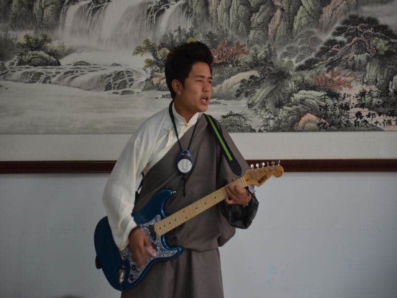 藏族学生丹增罗布表演了藏族的本土音乐