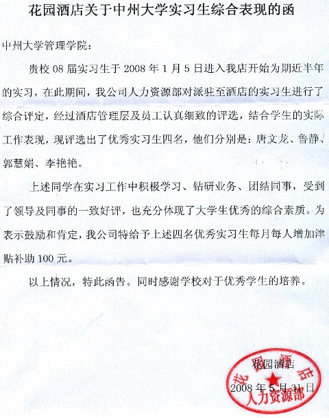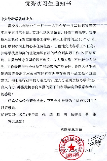 beat365官网05级旅游管理专业此次毕业实习的单位均是省内外知名的旅游企业,主要有厦门宝龙大酒店(五星级)、深圳富龙山奥林宾馆(四星级)、宁波华侨豪生大酒店(美国豪生饭店集团成员单位)、绍兴鉴湖大酒店、上海云根庭酒店、河南兴亚建国酒店(五星级)、河南花园酒店、河南省中国青年旅行社等。在五个月的实习中,学生们受到了实习单位的一致好评,实习单位于近日纷纷来电来函,对优秀实习生进行褒奖,对beat365官网旅游管理专业办学取得的成绩表示祝贺。一些实习单位已经同表现优秀的实习生达成了就业意向。相信实习单位的赞誉,一定会让学生更有信心面对今后工作的挑战。