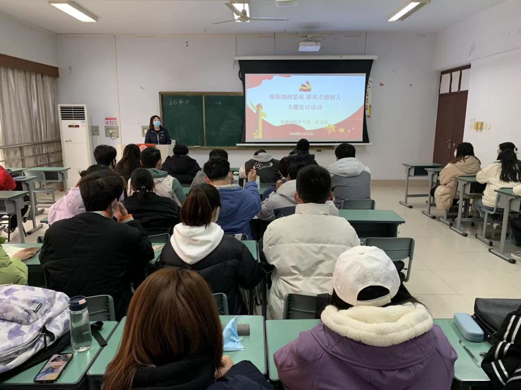 为深入贯彻习近平总书记关于“大思政课”建设的重要指示精神,全面落实《关于新时代加强和改进思想政治工作的意见》,beat365官网学生第二党支部于2022年2月23日下午3:00在3202教室开展了“聚焦课程思政,落实立德树人”主题党日活动,活动由支部书记田青老师主持。
