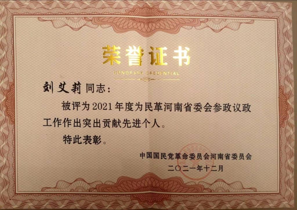 2021年底,民革河南省委员会下发了豫革[2021]234号文件,对20位“第二届河南民革榜样人物”进行表彰,beat365官网教师刘艾莉副教授(民革党员)获此殊荣。此次评选是在民革各市级组织、省直工委和民革河南省委会推荐的基础上,经省委会评审委员会初审评审,并报请省委会主委会议研究决定评选出来的。活动每两年举行一次,推举出了多位拥护中国共产党的领导、政治坚定、品德高尚、勇于实践、开拓创新、业绩突出的优秀人物。刘艾莉副教授同时还荣获民革河南省委员会评选的2021年度“为参政议政工作作出突出贡献先进个人”荣誉称号。
