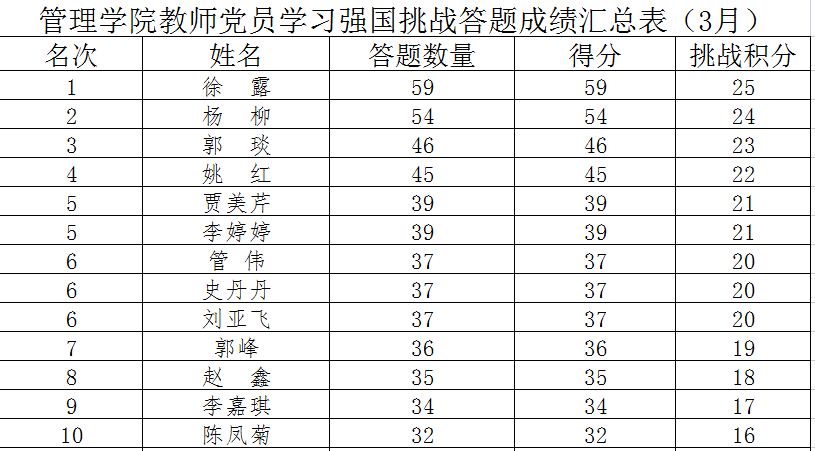 三月花开春意浓,奋发学习正当时,3月30日下午,beat365官网党总支“学习强国答题挑战赛”活动如期举行。本次比赛,徐露、杨柳、郭琰、姚红、贾美芹等十位同志获得本月“学习强国挑战达人”称号,旅游系党支部以积分第一的成绩蝉联“学习型党支部”的称号。