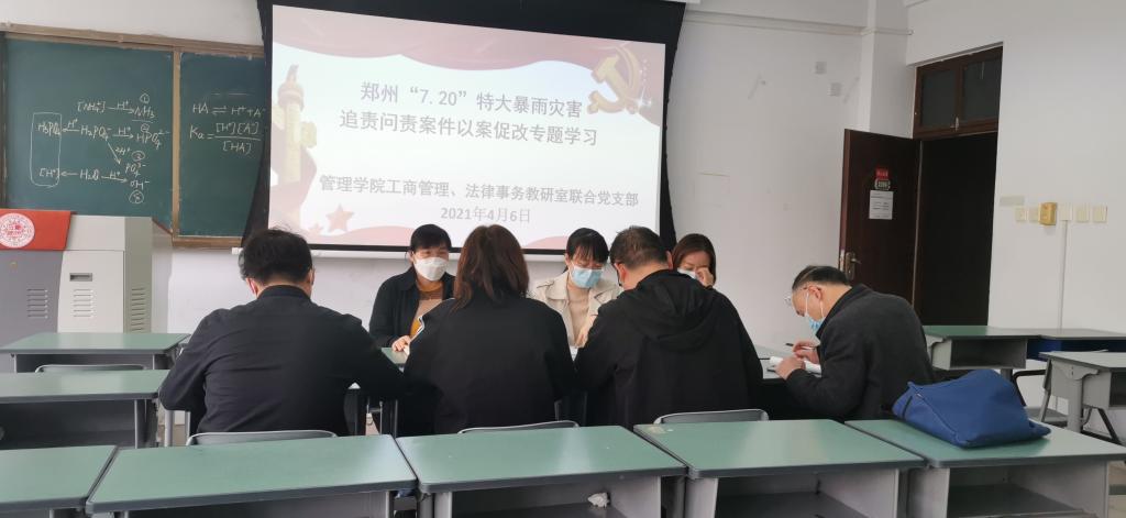 为了贯彻落实学校关于郑州“7.20”特大暴雨灾害追责问责案件以案促改专题学习计划的安排,工商管理、法律事务教研室联合党支部于4月6日下午在博识楼3206组织开展郑州“7.20”特大暴雨灾害追责问责案件以案促改主题党日活动。