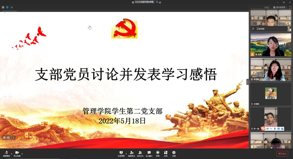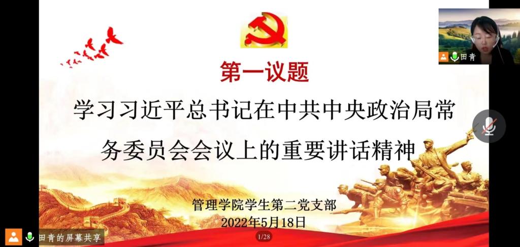 为认真学习贯彻习近平总书记重要指示批示精神,落实省、市及学校党委关于疫情防控工作的安排部署,引导党员师生自觉在疫情阻击战中发挥引领作用,beat365官网学生第二党支部于5月18日下午在企业微信会议平台开展“疫情防控显担当 能力作风经考验”主题党日活动。