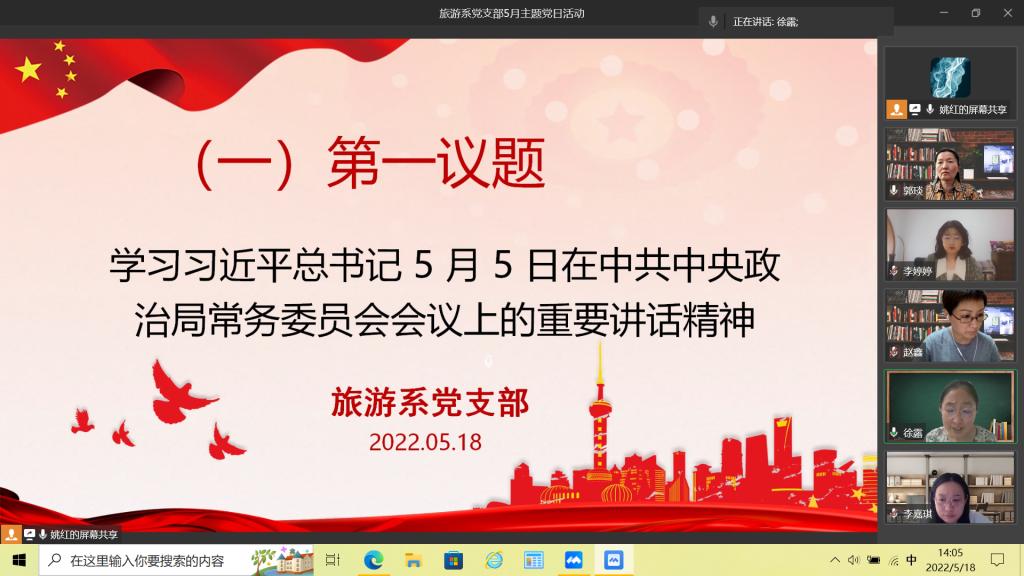 会上,首先进行了第一议题学习,由旅游系党支部徐露老师领学了《习近平总书记5 月 5 日在中共中央政治局常务委员会会议上的重要讲话》,并要求大家认真领会讲话精神,坚定信念,自觉在思想上政治上行动上同党中央保持高度一致。始终保持清醒头脑,毫不动摇坚持“动态清零”总方针。