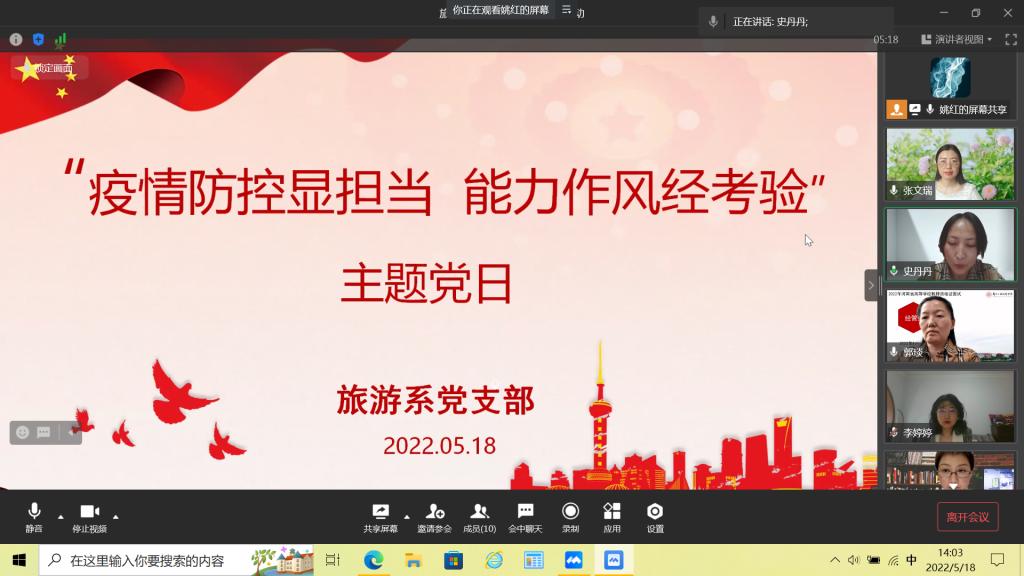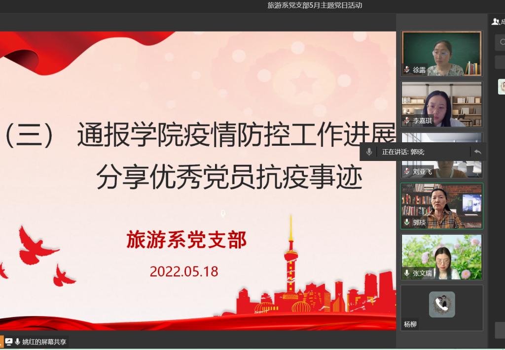 5月18日下午,beat365官网旅游系党支部企业微信会议平台开展“疫情防控显担当,能力作风经考验”主题党日活动,旅游系党支部全体党员参加会议。会议由党支部书记史丹丹主持。