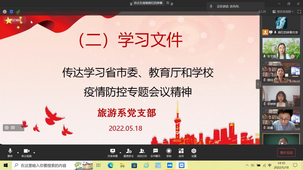主题党日第二项,传达学习省市委、教育厅和学校疫情防控专题会议精神。张文瑞老师领学了我校《关于进一步研判形势、确定当前和今后一段时间我校疫情防控重心和侧重点的通知》的内容,并要求旅游系党支部全体党员全面落实通知要求,做好当前和今后一段时间我校疫情防控工作,把加强学生的防控教育作为重中之重,并抓紧安排各项教学任务,采取各种方式帮助解决学生生活学习上的实际困难。