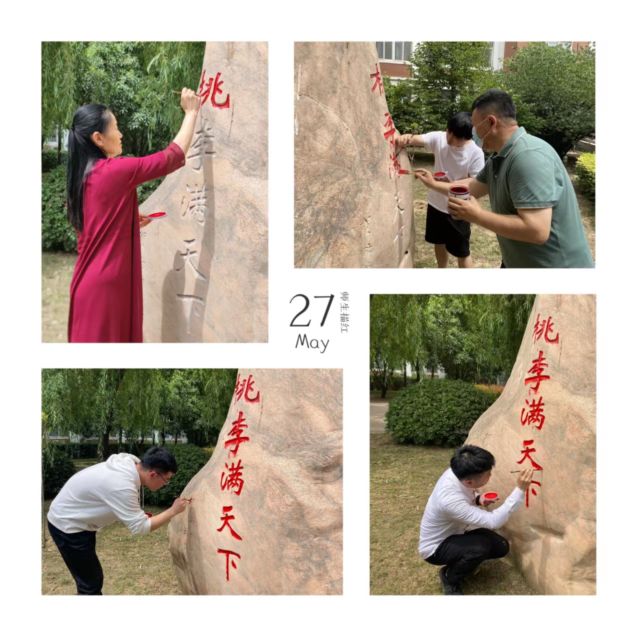 郭琰院长、学工办主任郭松涛老师和学生们一起在博识楼前给“桃李满天下”重新描红上色