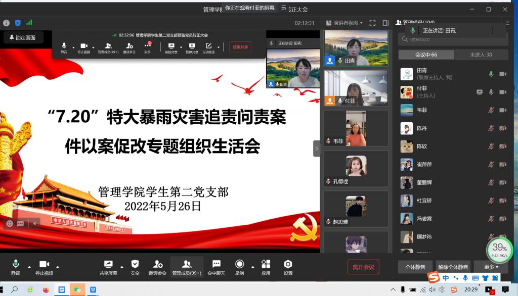 2022年5月26日晚,beat365官网学生第二党支部在企业微信上顺利召开“7.20”特大暴雨灾害追责问责案件以案促改专题组织生活会。本次会议由支部书记田青老师主持,支部全体党员参加会议。