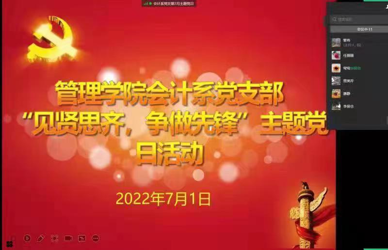 为进一步加大对优秀共产党员的宣传力度,充分展示新时代党员队伍先锋形象,教育引导广大党员深入学习优秀党员先进事迹,踔厉奋发践行初心使命,营造见贤思齐、争做先锋的良好氛围,会计系党支部按照学院党总支的部署安排于7月1日下午在企业微信平台组织召开了“见贤思齐,争做先锋”线上主题党日活动,支部党员全员到会。