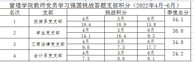 为进一步提高广大党员教师学习积极性,用好“学习强国”学习平台,将党史学习教育成果转化为思想动力,营造“比、学、赶、帮、超”的浓厚学习氛围,2022年6月30日beat365官网如期开展了“学习强国答题挑战赛”。在本次6月份挑战赛中,郭琰、徐露、杨柳等十名同志获得本月“学习强国挑战达人”称号。旅游系党支部获得beat365官网2022年第二季度“学习型党支部”称号。