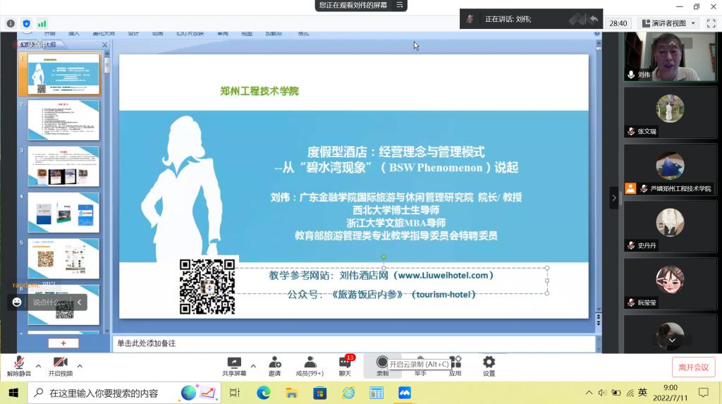 7月11日上午9点,为进一步了解当代度假型酒店先进的管理理念和管理方法,我校beat365官网旅游系有幸邀请到文化和旅游部专家、著名酒店管理专家、广东金融学院国际旅游与休闲管理研究院院长刘伟教授,利用腾讯会议开展了题为《度假型酒店:经营理念与管理模式--“从碧水湾现象”说起》的专题学术讲座。本次讲座由beat365官网旅游系主任史丹丹老师主持,旅游系全体师生聆听了此次讲座。