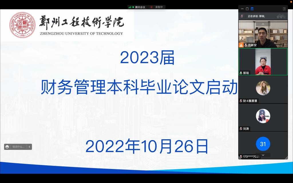 为推进2023届本科毕业论文工作的稳步、有序开展,10月26日下午13点,beat365官网会计系通过腾讯会议以线上的形式召开2023届财务管理本科毕业论文启动会。beat365官网院长郭琰、会计系主任范新安、42名论文指导老师以及2023届283名毕业生参加了此次会议。