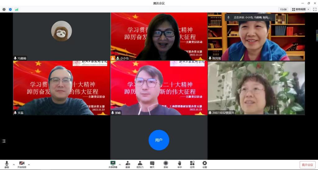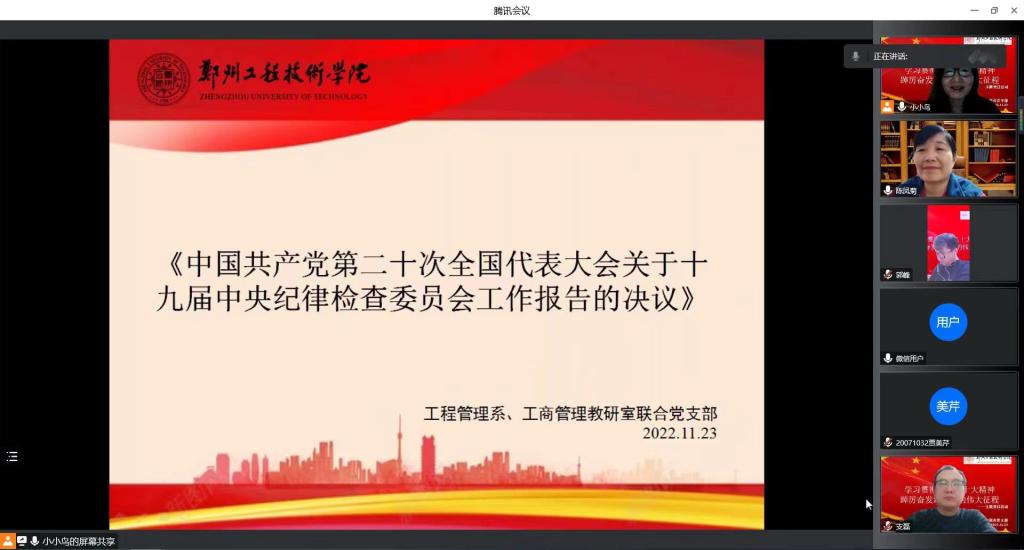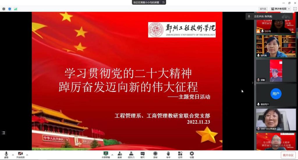 为了深入学习贯彻党的二十大精神,进一步提高基层党组织的凝聚力,工程管理系、工商管理教研室联合党支部于11月23日16:00,开展了“学习贯彻党的二十大精神 踔厉奋发迈向新的伟大征程”主题党日活动,本次活动通过腾讯会议召开,由工程管理系、工商管理教研室联合党支部书记孙海玲主持,支部全体党员共同参加了此次主题党日活动。