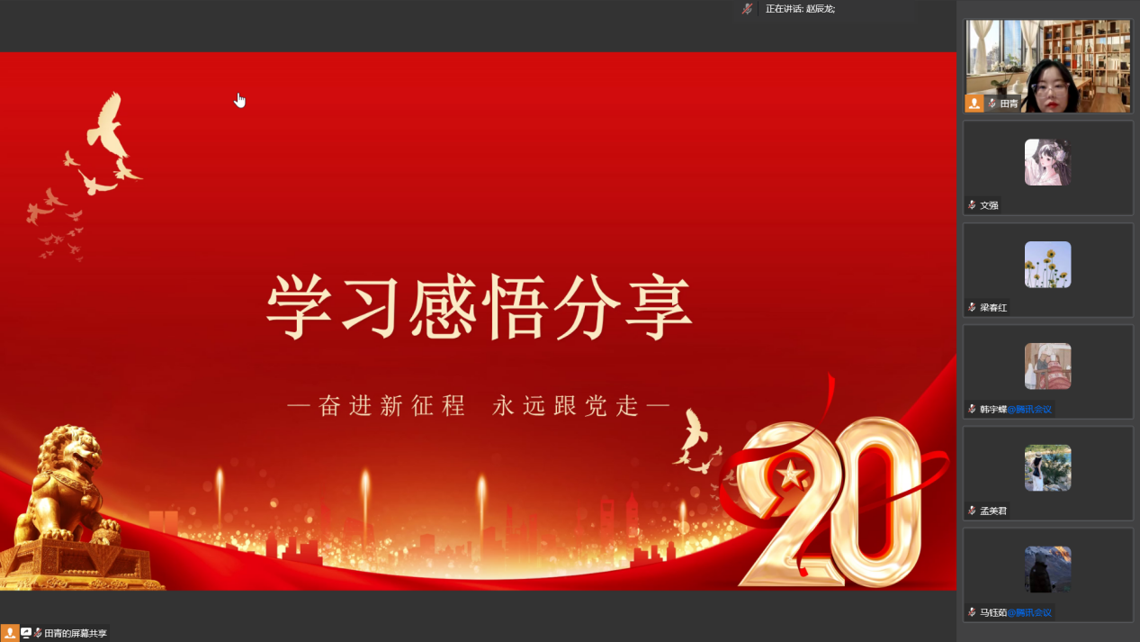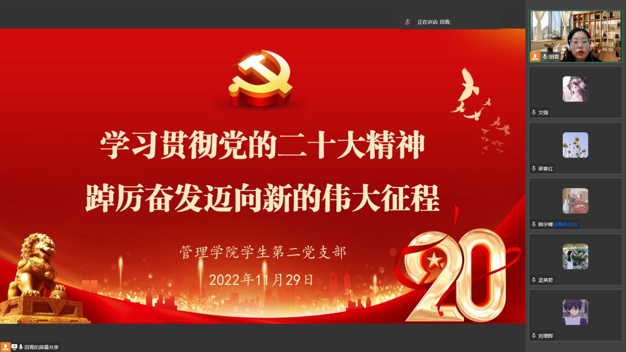 为深入学习宣传贯彻党的二十大精神,进一步保持昂扬向上的精神状态和奋斗姿态,beat365官网学生第二党支部在11月29日下午四点开展了“学习贯彻党的二十大精神 踔厉奋发迈向新的伟大征程”活动。本次活动由学生第二党支部书记田青主持,beat365官网党总支书记韦菲以及支部全体党员参加。