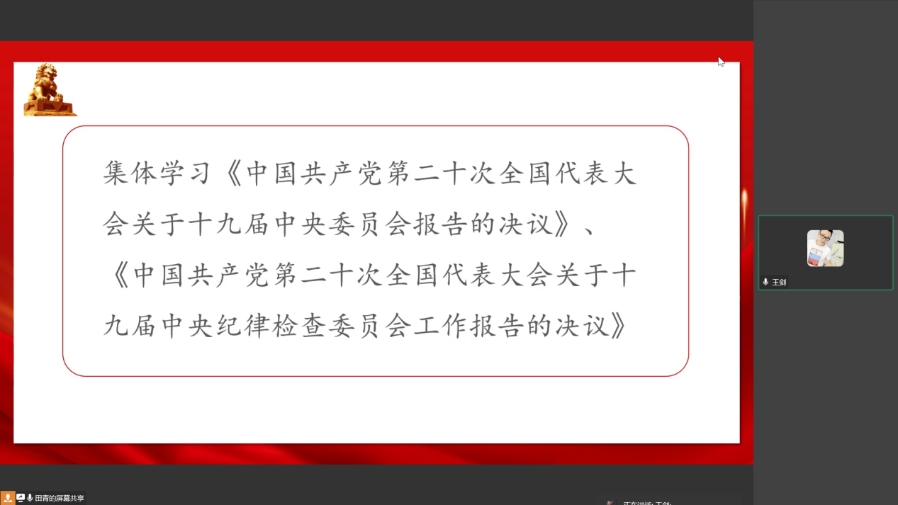 首先进行第一议题,田青老师领学了习近平总书记在二十届中央政治局常委同中外记者见面时的重要讲话。随后,王剑老师领学了《中国共产党第二十大全国代表大会关于中央委员会报告的决议》、《中国共产党第二十次全国代表大会关于十九届中央纪律检查委员会工作报告的决议》、《中国共产党第二十次全国代表大会关于<中国共产党章程(修正案)>的决议》。