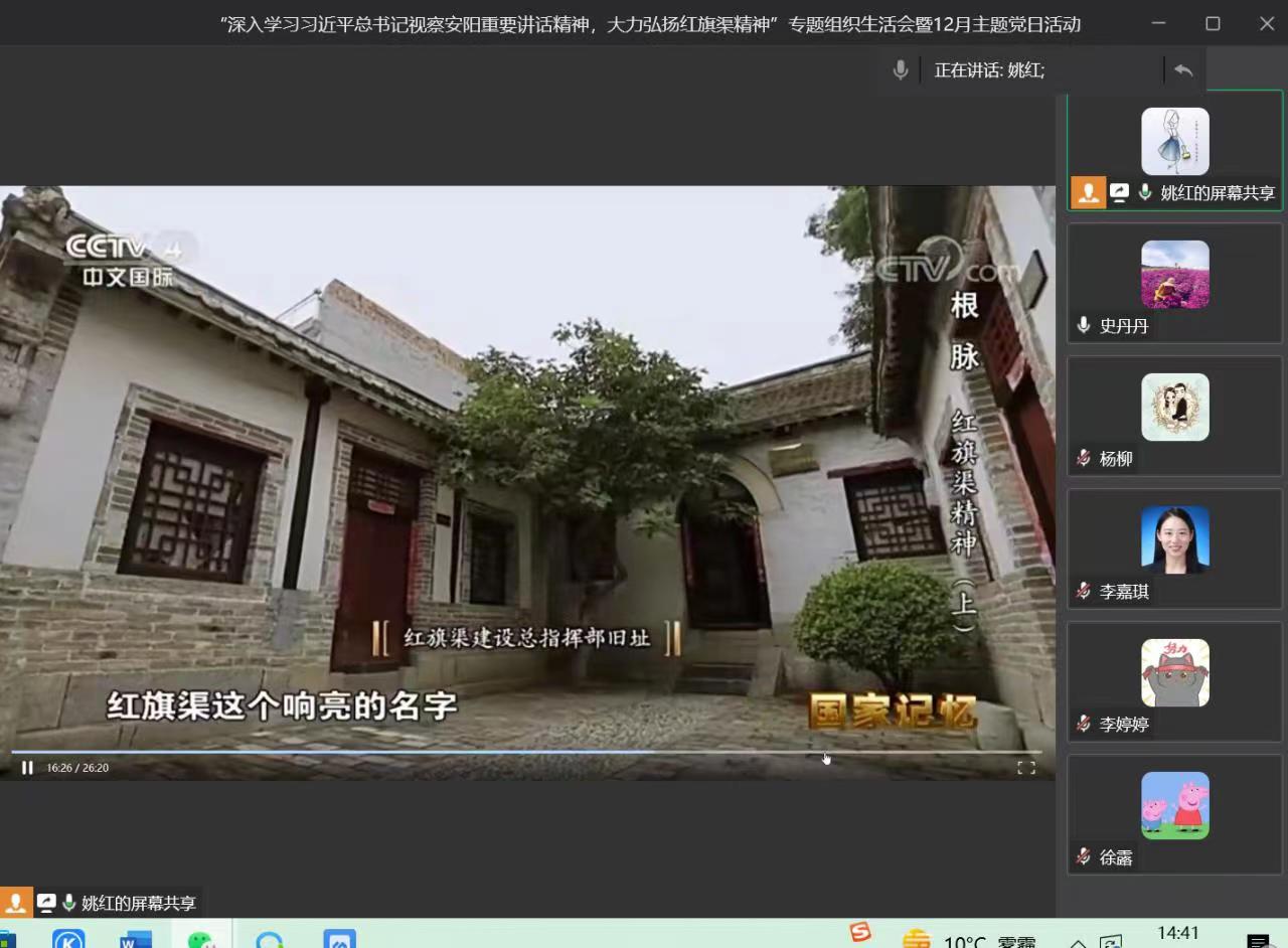 会议第二个议程“深刻感悟红旗渠精神”,组织支部党员观看中央电视台《国家记忆》栏目播出的专题片《根脉--红旗渠精神》,引导党员进一步深刻理解把握“自力更生、艰苦创业、团结协作、无私奉献”红旗渠精神的丰富内涵。