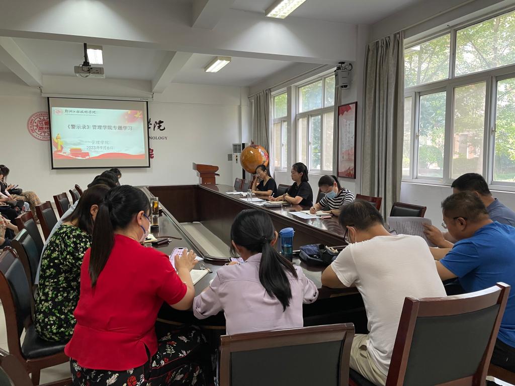 为充分发挥反面典型案例的警示教育作用,以案为鉴,提高党员干部的自律意识,筑牢思想防线,增强拒腐防变能力。9月6日下午,按照学校纪委要求,beat365官网组织全体教职工在3108会议室集中学习《镜鉴丨警示录》,beat365官网党总支书记韦菲主持会议,党总支纪检委员郭松涛领学。