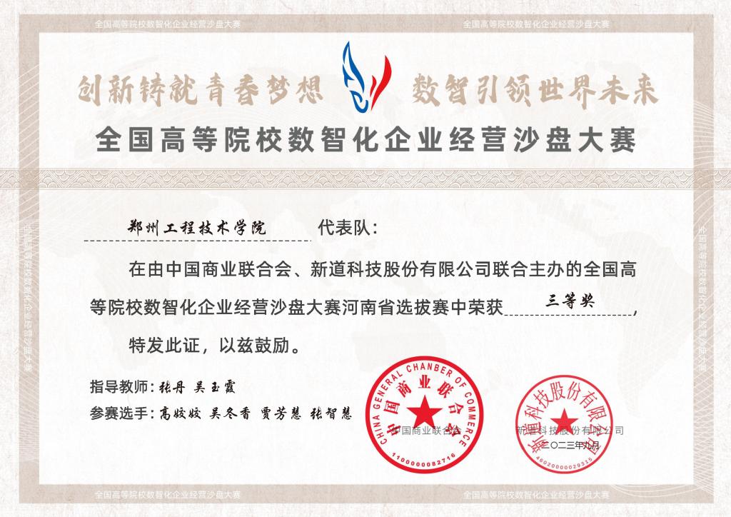 9月26日至27日,由中国商业联合会、新道科技股份有限公司联合主办,郑州大学承办的“第十九届全国高等院校数智化企业经营沙盘大赛河南省选拔赛(本科组)”比赛在郑州大学进行。这次比赛由来自省内40所本科院校的108支队伍,共计600余位师生参与。我校范新安、张丹、吴玉霞、郭峰老师指导的团队,荣获此次大赛省内三等奖。