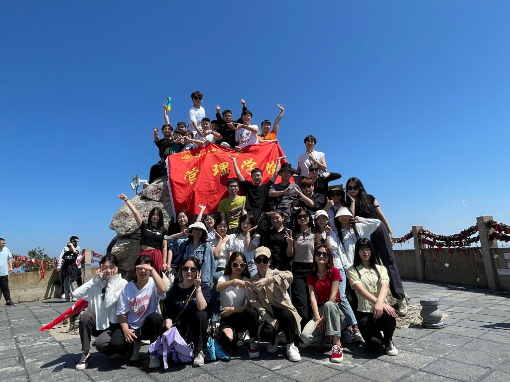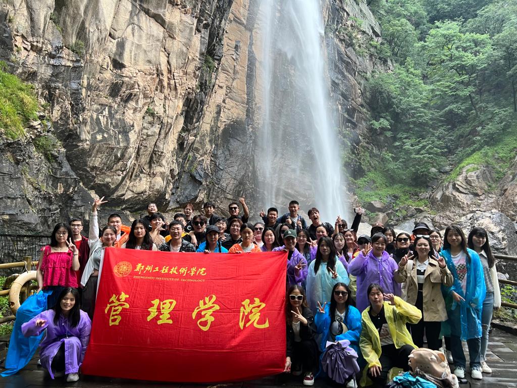 行程的第一天,白云山景区小雨绵绵不断,大家到酒店安顿好行李后,穿上雨衣,乘坐景区大巴到九龙瀑布景点,在两位老师一前一后的陪伴下,同学们有序的进入景点,虽然天公不作美由小雨转大雨,但浇不灭年轻人勇于探索攀登的热情,两个多小时后,大家集体打卡九龙瀑布,第一天的任务圆满完成。第二天行程安排登玉皇顶,玉皇顶海拔2216米,有“中原极顶”、“绿色心脏”之誉。登顶之初,同学们信心满满,能量十足。走到半山腰时,已经有同学体力下降,逐渐慢了下来,但大家仍然坚持,继续向上攀登,最终同学们成功登顶,感受到俯瞰一览众山小的壮美景色,体验到攀登攀登再攀登,无限风光在险峰的心境,更为自己的坚持和毅力感到自豪。