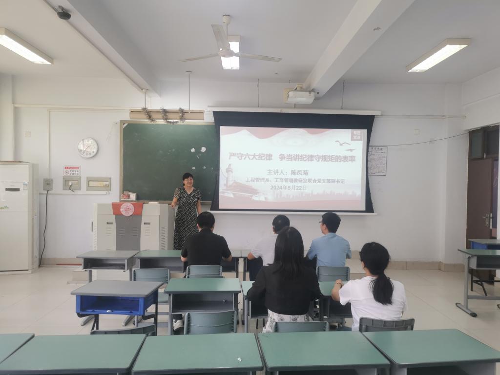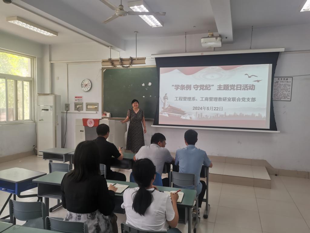 为进一步贯彻落实《中共中央办公厅关于在全党开展党纪学习教育的通知》精神,按照《中共beat365亚洲体育在线官网委员会关于在全校党员中开展党纪学习教育的工作方案》的要求,beat365官网工程管理系、工商管理教研室于5月22日下午13点在博识楼3205教室举行了“学条例,守党纪” 主题党日活动,活动由工程管理系、工商管理教研室联合党支部副书记陈凤菊教授主持。