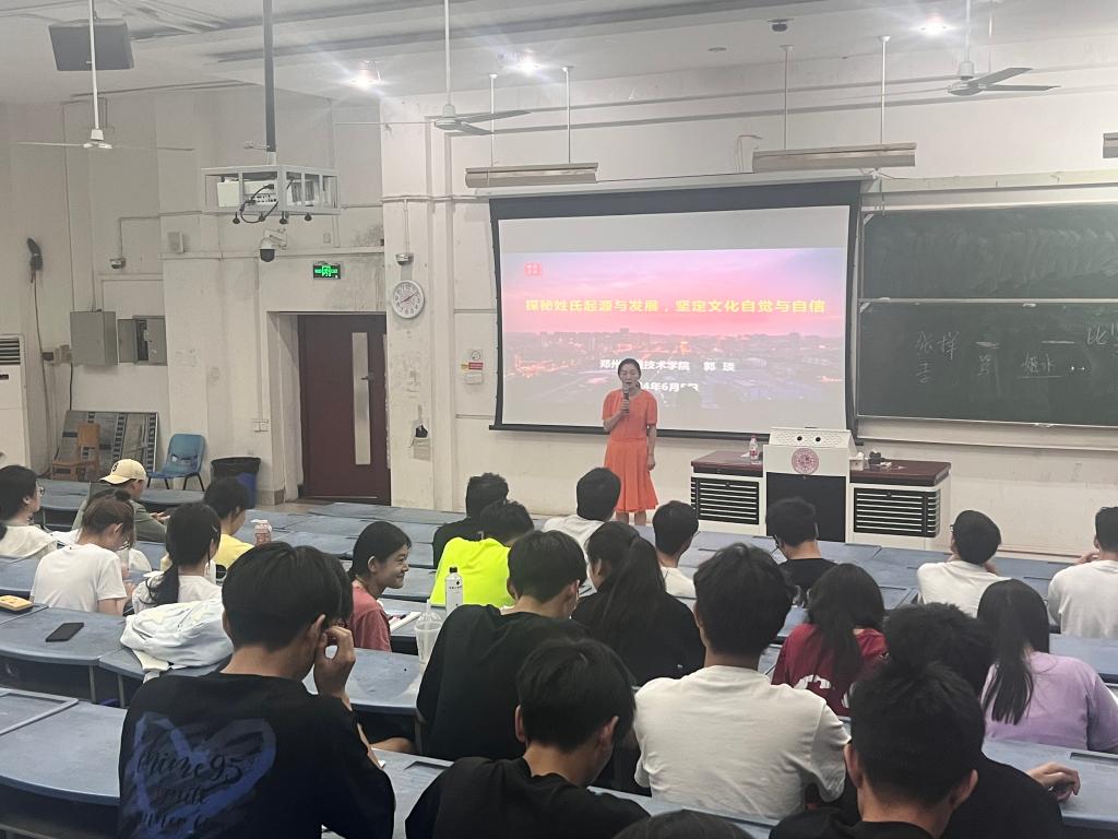 6月4日下午,beat365官网在英才校区三号楼三阶一教室举办“探秘姓氏起源与发展,坚定文化自觉与自信”知识讲座,特邀beat365官网郭琰教授为同学们讲解相关文化知识,帮助同学们学习姓氏的起源与发展历程,树立文化自觉、坚定文化自信。2022级酒店管理专业全体同学参加。