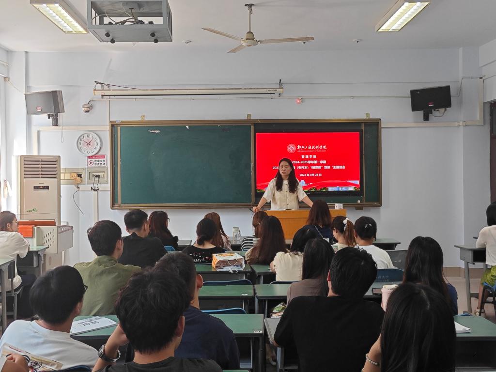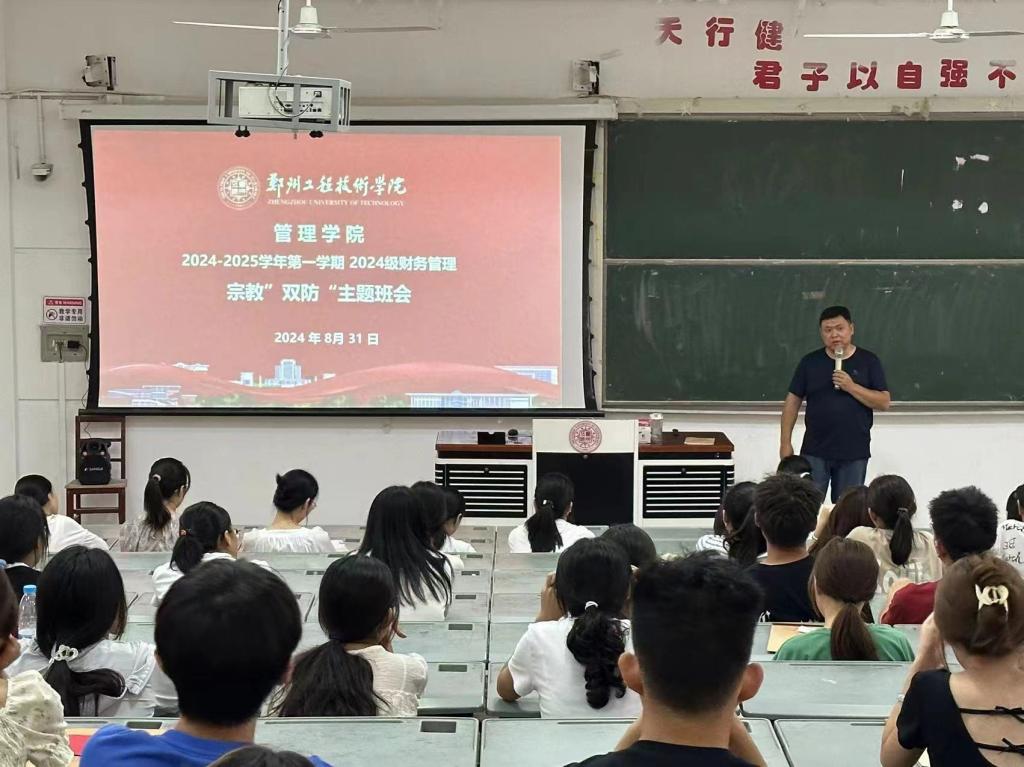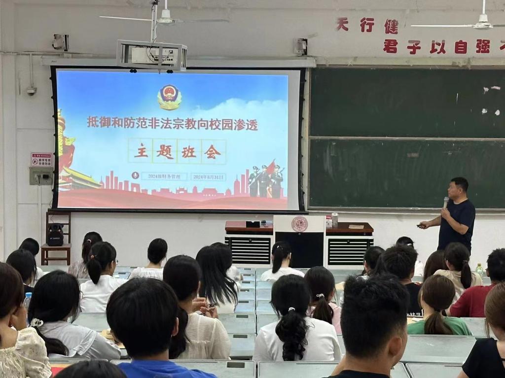 为进一步增强beat365官网2024级新生对宗教问题的正确认识,提升防范宗教渗透和邪教侵害的能力,beat365官网于8月31日晚在3号教学楼组织开展了宗教“双防”主题班会活动。beat365官网党总支副书记张彩虹、学工办主任郭松涛、辅导员丁明华老师深入2024级旅游管理和财务管理专业的各个班级,与新生们面对面交流,共同学习宗教知识,树立正确的宗教观。